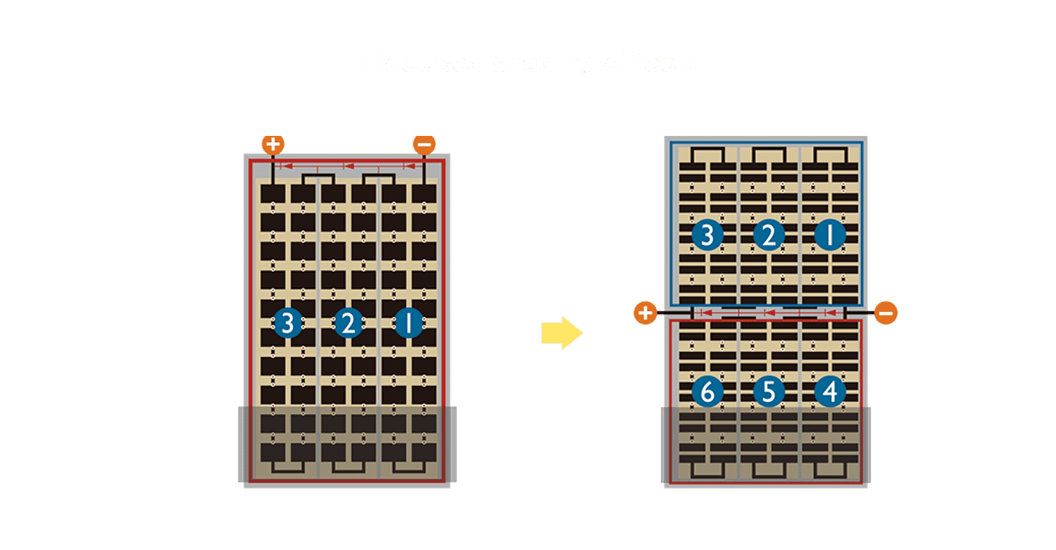 - 电池使用多条铜导线 (Copper wire) 于电池片上形成较短的电流路径,,,,提高电流收集效率,,采用圆形设计的铜导线较传统扁平式的铜焊带 (Ribbon),,,可增加入射至电池的光线量。。。